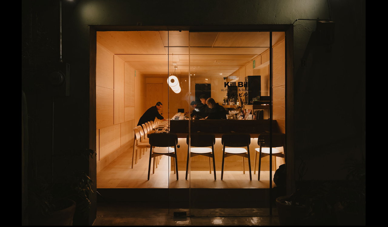 "A 14-seat sushi-and-robata counter inspired by Tokyo listening bars — dim light, smooth jazz, and three omakase tiers dubbed Kill, Bill, and Kill Bill. The menu changes daily with the best available fish."