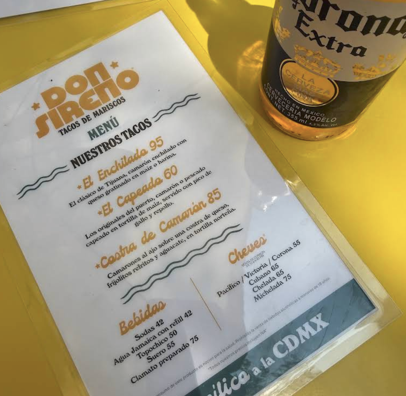"Baja and Pacific port-style seafood tacos brought to CDMX — taco enchilado, costra de camarón, aguachile negro. Daytime spot with micheladas, free jamaica refills, and no pretension."